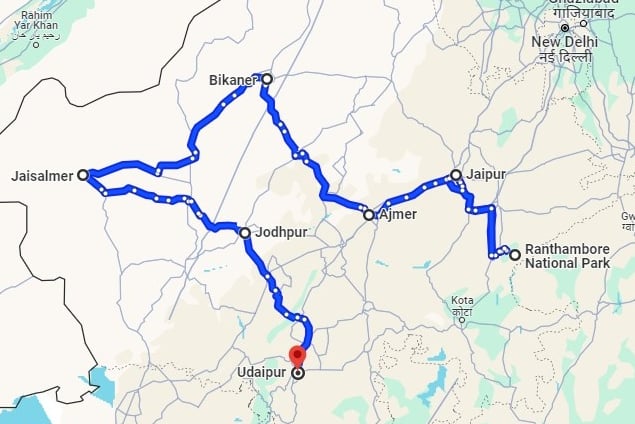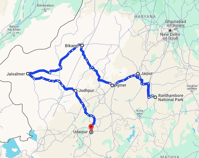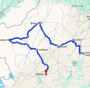 Ranthambore 1N, Jaipur 1N, Bikaner 2N, Jaisalmer 2N, Jodhpur 2N, Udaipur 3N