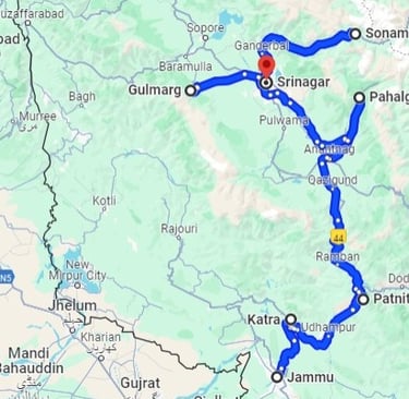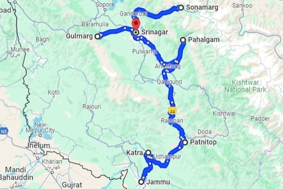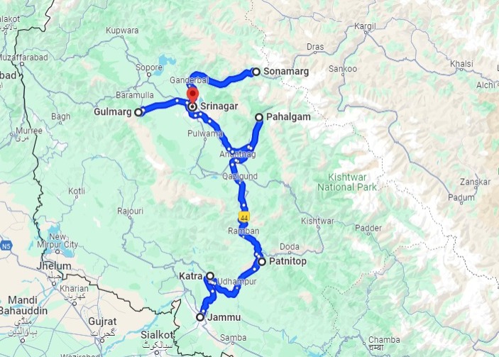 Katra 2 N, Patnitop 1 N, Pahalgam 2 N, Gulmarg 1 N, Srinagar 3 N